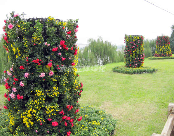 景觀花柱,規(guī)格:直徑1000mm、1470mm,高度2米起訂,按照1米的高度可定制。 由鋼骨架、單孔花架、卡盆、卡扣、灌溉系統(tǒng)、無(wú)紡布袋配以各種花草而成。